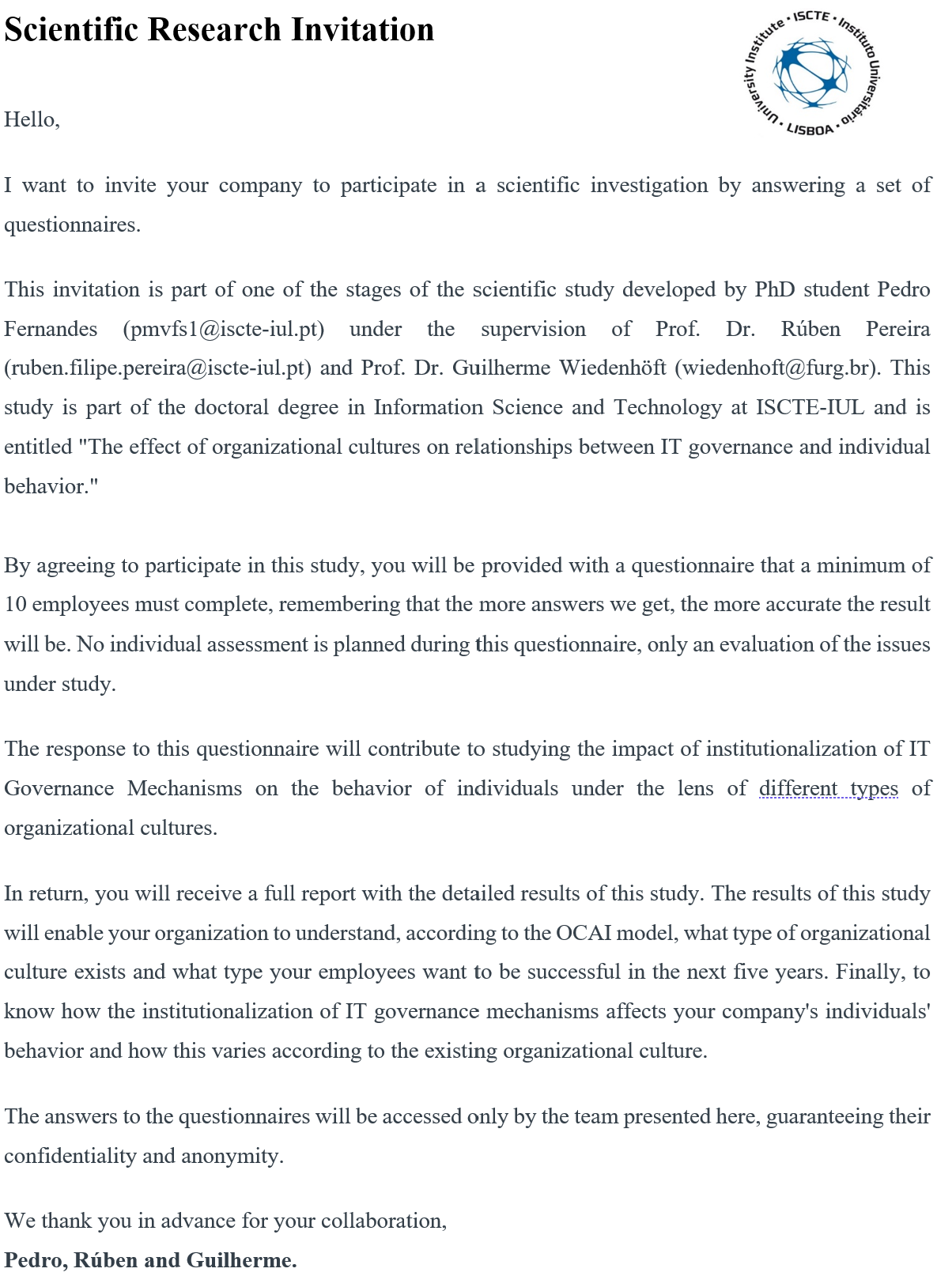 Hello Linux Users of Victoria! Hope this email finds you well. My name is Pedro, I am a PhD student at the University of Lisbon, and I would like to invite you and your company to participate in my PhD survey research. This research aims to study the relationship between IT Governance, individual behavior, and the culture in an organization. In return, I will give a full report that will allow Linux Users of Victoria to understand and have the results of the study. The survey is anonymous. The minimum number of answers we need is 10, remembering that the more responses we get, the more accurate the results will be and the more data I have to move forward with my study. If you agree to participate in this research, please reply to this email, and I will send you a link with the individual questionnaire for the Linux Users of Victoria employees. Attached is the invitation letter where are more details about this research. Hope to have your collaboration, See you soon, Pedro. [Uma imagem com texto Descri??o gerada automaticamente]